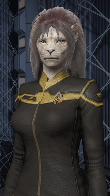 | Physical Description | A short Caitian of Brown/Grey Fur, Long Thick Tail, and Long Brown Hair. She tends to be skittish and sometimes appears dishevaled from lack of sleep, fueled by caffeine. |